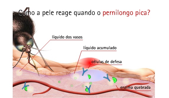 É a saliva do mosquito, que ele utiliza como anticoagulante quando pica. Isso faz o corpo produzir a reação histamínica, que cria um processo alérgico, causando a coceira. O que significa que, quanto antes você passar um reagente na picada, mais eficaz será o tratamento.